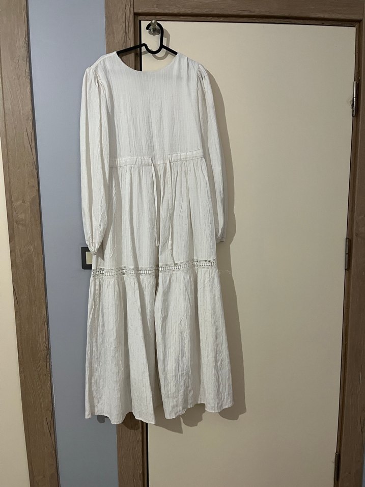 Kadınlar için beyaz uzun keten elbise, bol kesim ve pile detaylıdır. Uzun kollu ve yuvarlak yakalı, minimal ve bohem tarz sunar. Günlük kullanım için uygundur.