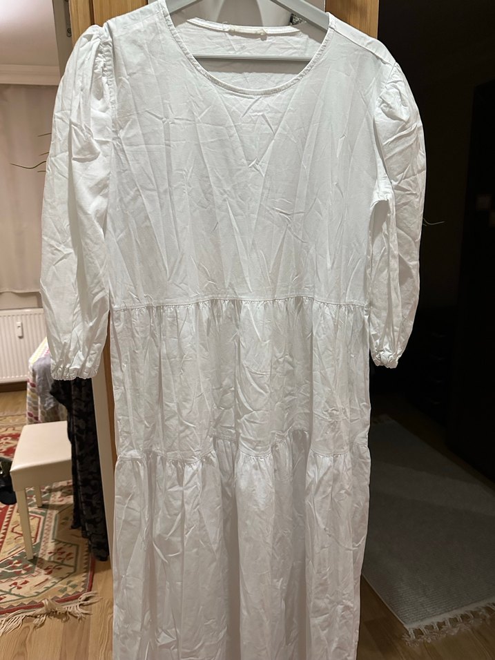 Kadınlar için keten kumaştan, uzun kollu, bol kesim ve drapeli beyaz uzun elbise. Minimalist ve bohem tarzda, günlük kullanıma uygundur. ️51 en ölçüsü 125 boy ölçüsüdür