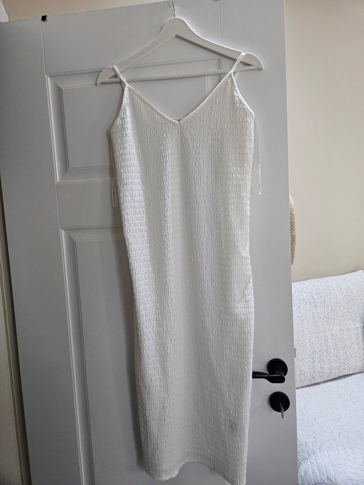 Kadınlar için uzun beyaz keten elbise, V yaka ve pileli detaylara sahiptir. İnce askılı ve regular kesimdir, günlük sokak stiline uygundur.