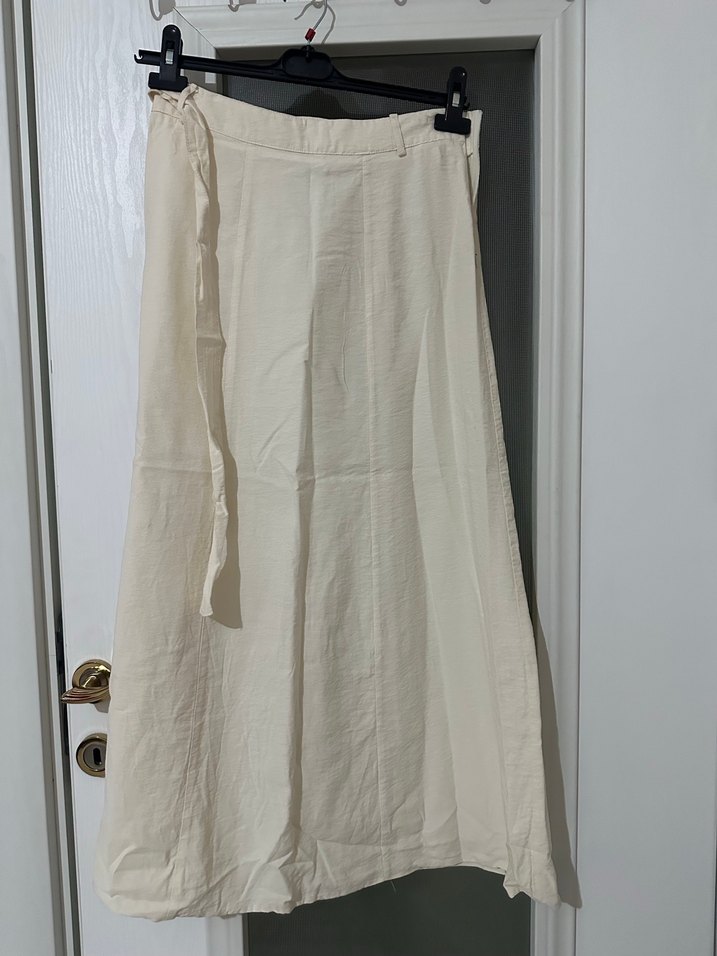Kadınlar için beyaz, keten kumaştan yapılmış, drapeli, uzun ve rahat kesimli minimalist bohem tarzda etek. Günlük kullanım için uygundur.