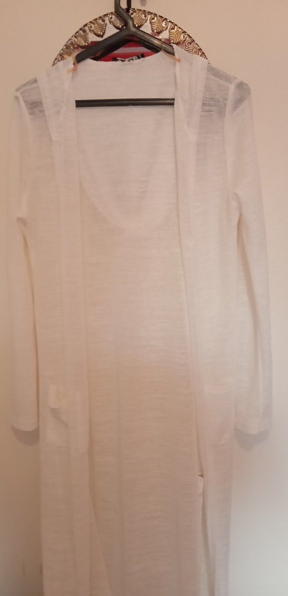 Kadınlar için uzun, keten kumaştan yapılmış, salaş kesim ve uzun kollu beyaz hırka. Drapeli tasarımı ve yuvarlak yakası ile minimalist ve bohem tarzını yansıtır.
