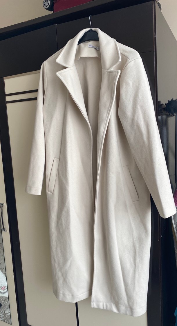Kadınlar için uzun, klasik kesim ve yaka detaylı beyaz kaban. Yumuşak ve sıcak kumaştan, minimalist ve desensiz tasarım, günlük kullanıma uygun.