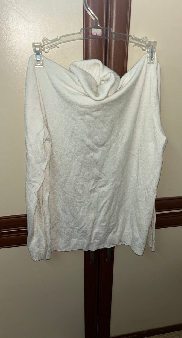 Beyaz, uzun kollu, balıkçı yaka, dökümlü ve bol kesim kadın triko. Yumuşak keten kumaştan, günlük rahat sokak stili için uygundur.