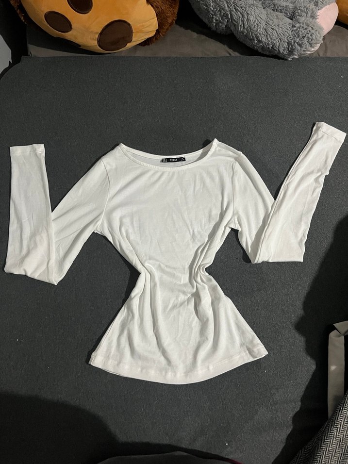 beyaz, uzun kollu ve tek renk, basic bluz. Yumuşak keten kumaştan, tekne yaka ve vücuda oturan tasarım.