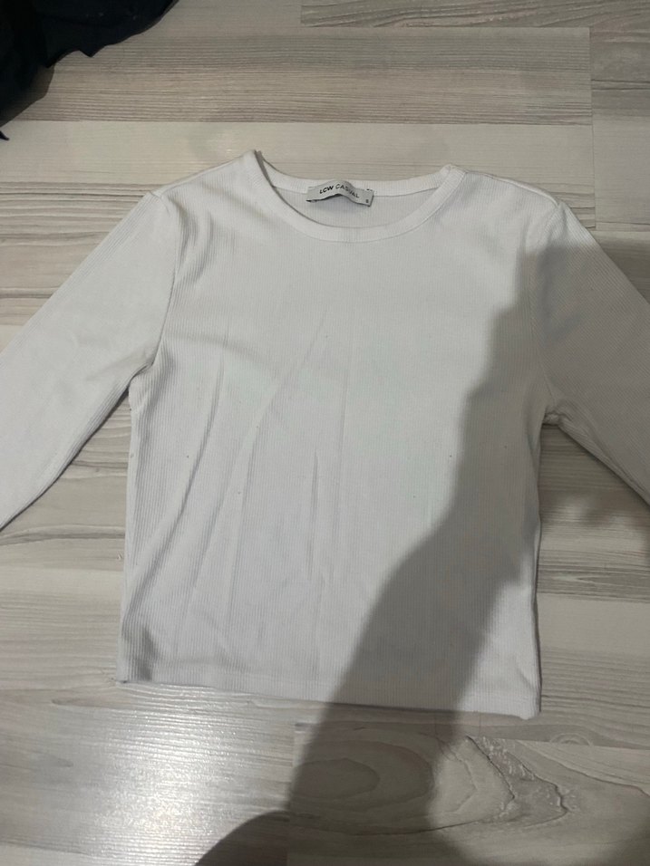 Pamuk kumaştan, uzun kollu, bisiklet yaka ve fitted kesime sahip beyaz kadın bluz. Minimalist ve desensiz tasarımı günlük kullanım için uygundur.