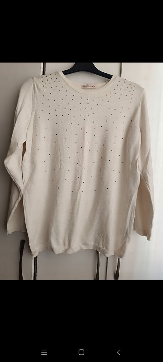 Beyaz, uzun kollu, yuvarlak yakalı kadın kazak. Pamuk örme, bol kesim ve normal boyda, sade ve minimal tarzda günlük kullanıma uygun.