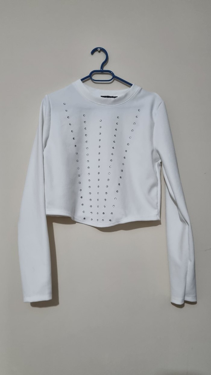 Beyaz, uzun kollu, fitted kesim crop sweatshirt; gri küçük taş detaylarıyla minimal ve şık görünüme sahip. L beden ancak ben S beden olmama rağmen krop olmasın diye aldım ancak giyemedim