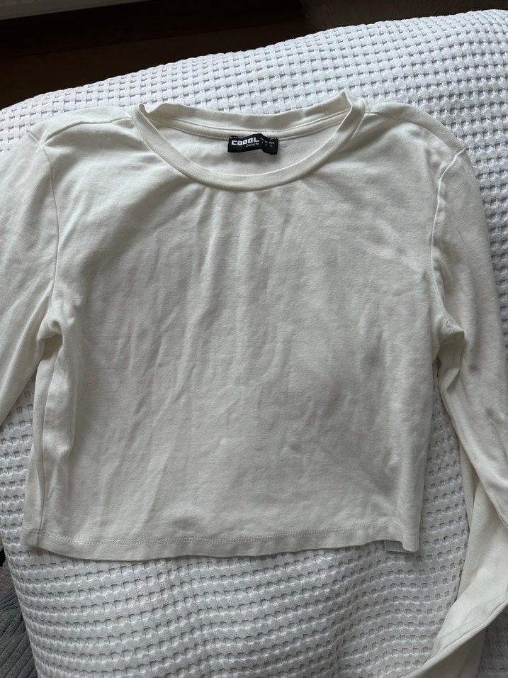 Beyaz, uzun kollu ve yuvarlak yakalı, yumuşak keten kumaştan yapılmış, vücuda oturan crop top. Minimalist tarzıyla günlük sokak stili için uygundur. Kırık beyaz