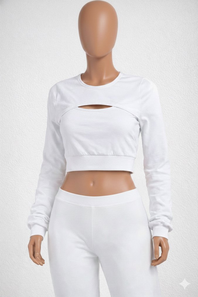 Pamuk kumaştan, uzun kollu ve yuvarlak yakalı, kısa kesim kadın beyaz crop top. Şık sokak stili için kesik detaylı, rahat ve gündelik kullanım için uygun parmak geçmelidir. Pazarlık vardır