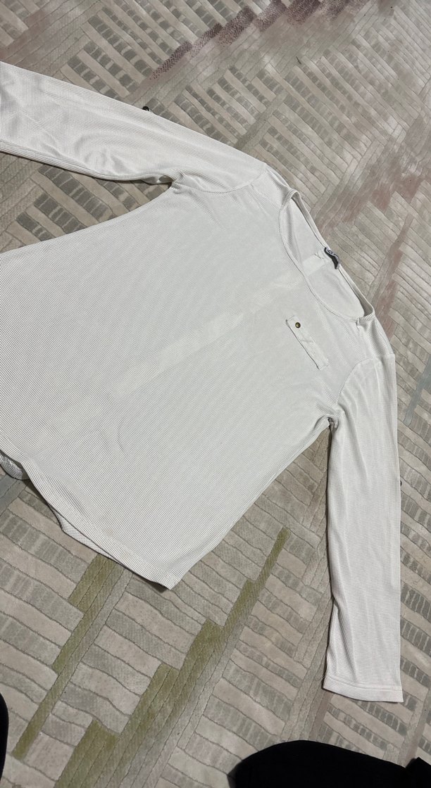 Düğmeli detaylı, beyaz uzun kollu, yakalı gömlek. Yumuşak sentetik kumaştan, bol kesim ve normal boyda, günlük rahat stil için uygun.