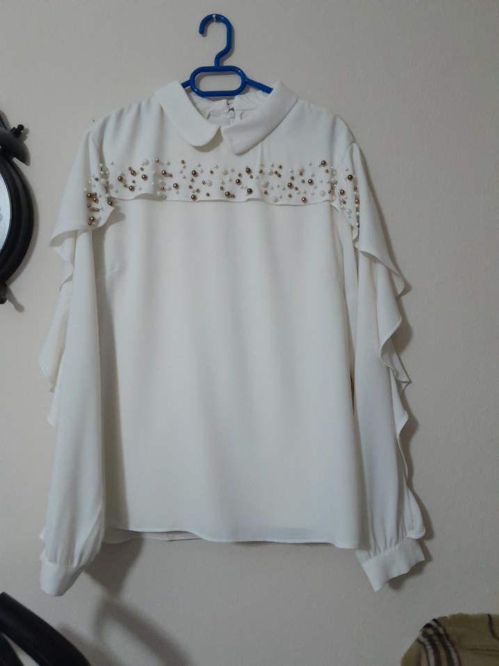 Beyaz uzun kollu gömlek, yakalı ve bol kesimdir. Kollarında fırfır ve göğüs kısmında nakış detayları bulunur. Yumuşak sentetik kumaştan üretilmiştir.