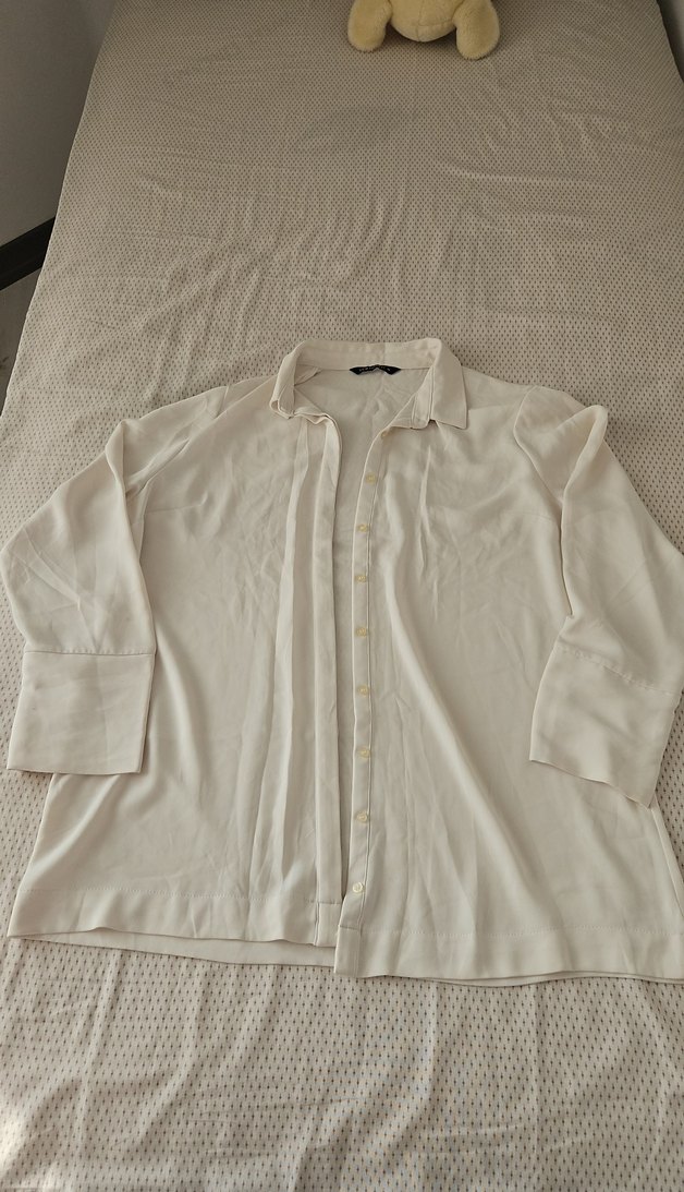Uzun kollu, düğmeli ve yakalı beyaz gömlek, rahat bir kullanım için bol kesimlidir. Günlük kullanım için uygundur.