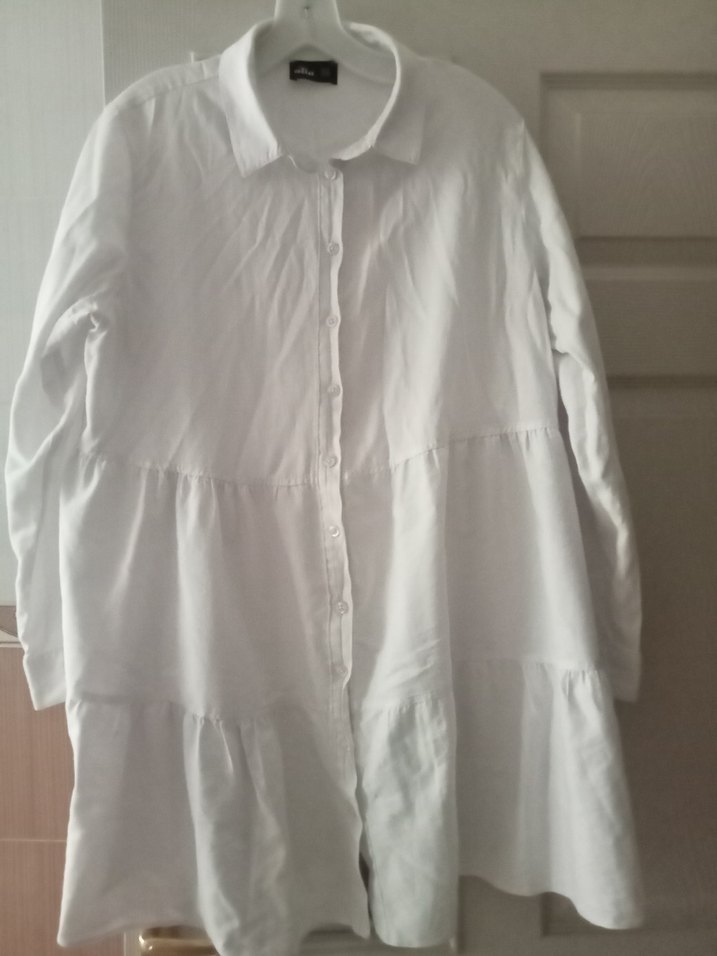 Uzun kollu, yakalı, düğmeli beyaz gömlek elbise, bol kesim ve midi boyda, günlük rahat kullanıma uygundur.