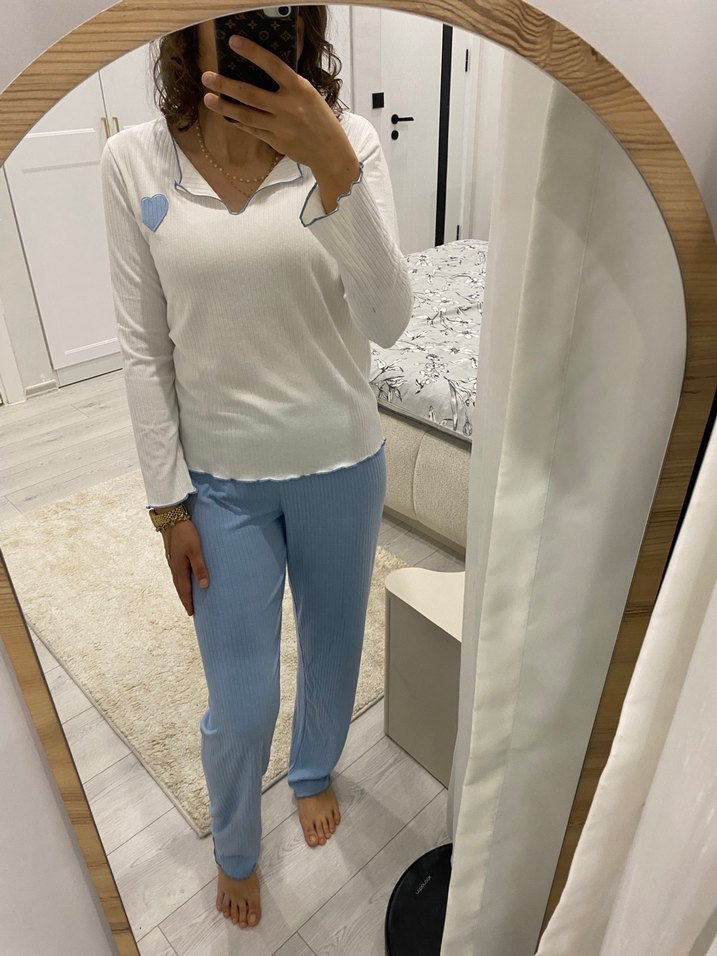 Kadınlar için beyaz uzun kollu üst ve pastel mavi midi boy pantolondan oluşan bol kesim pijama takımı. Rahat ve yumuşak dokulu, günlük kullanıma uygun.