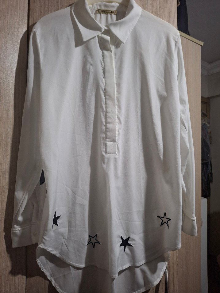 Pamuklu, uzun kollu, düğmeli, yakalı ve etek kısmında nakışlı yıldız detaylı bol kesim beyaz gömlek. Günlük rahat stil için uygundur. ufak bir defosu var. fotoğraflarda ekledim görebilirsiniz. kol ve etek detayında bulunan yıldız gibi birşeyle yada broş ile kapatılabilir durumdadır