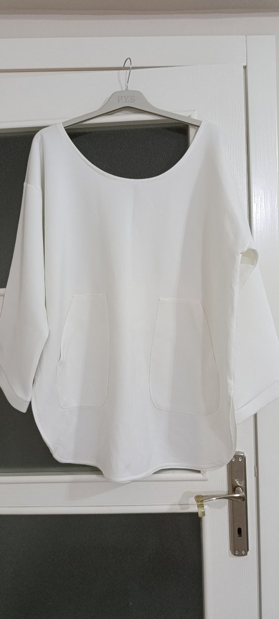 Beyaz pamuk kumaştan, yuvarlak yakalı ve uzun kollu, bol kesim kadın bluz. Günlük sokak stili için sade ve şık.