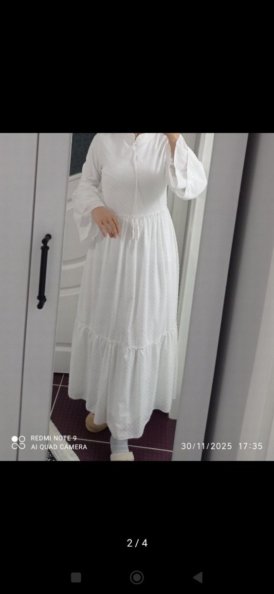 Beyaz uzun kollu pamuklu kumaştan, salaş kesim, fırfırlı detaylı, V yakalı bohem tarzda sade elbise. nikah ve bayramlarda giyilir , mütevazı ve minimalist.