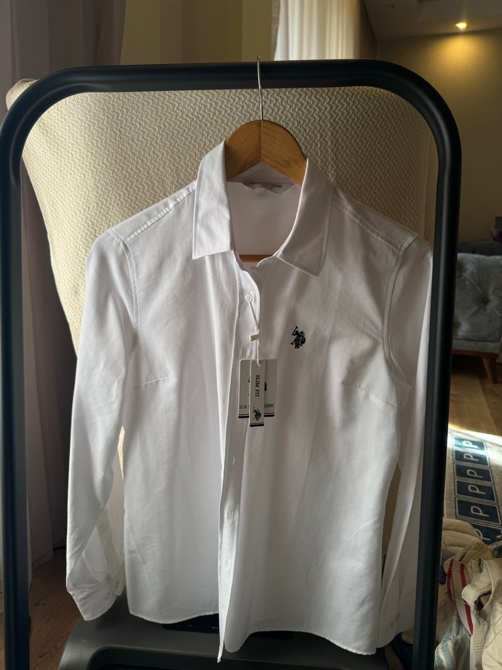 Beyaz, uzun kollu pamuklu gömlek, yakalı ve düğmeli, normal kesim ve midi boyda, günlük rahat kullanım için uygundur.