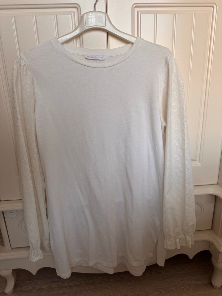 Kadınlar için beyaz, uzun kollu ve yuvarlak yakalı pamuklu tişört. Rahat kesimi ve sade tasarımıyla günlük kullanıma uygundur. Bana çok bol oldu iade de edemedim bir kaç kere ancak giyildi