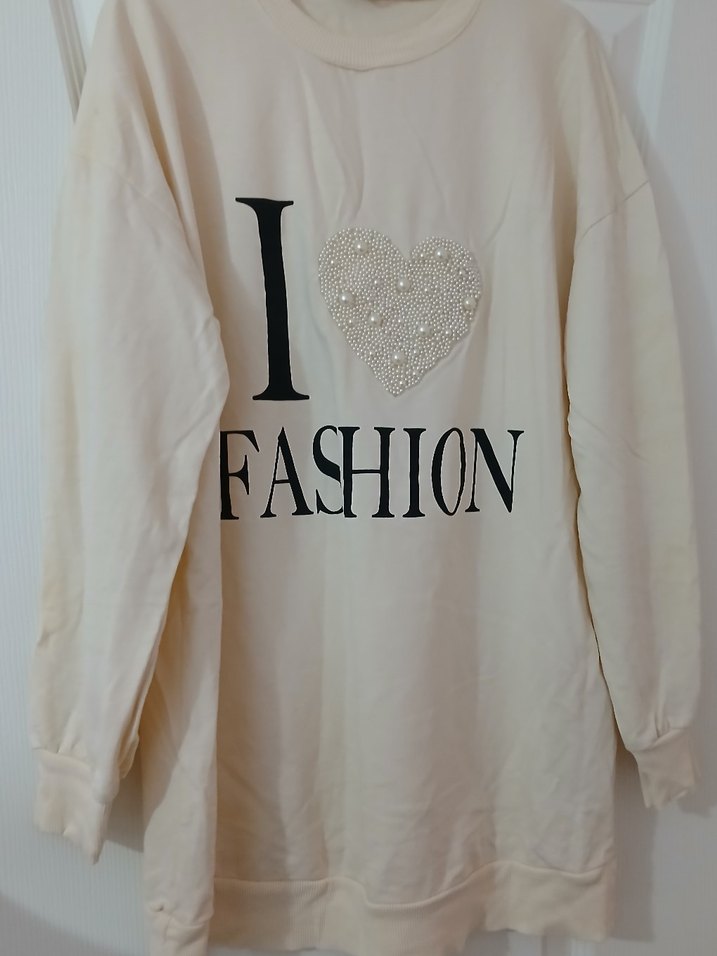 Pamuklu beyaz uzun kollu sweatshirt, bol kesim ve bisiklet yaka. Önünde payetli kalp ve "FASHION" yazılı baskı bulunur. Günlük rahat Paris tarzı için uygun.