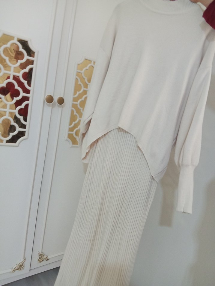Kadınlar için uzun, bol kesim, piliseli detaylı, yüksek yakalı ve uzun kollu beyaz keten triko. Rahat ve günlük kullanım için uygundur. ❄️
