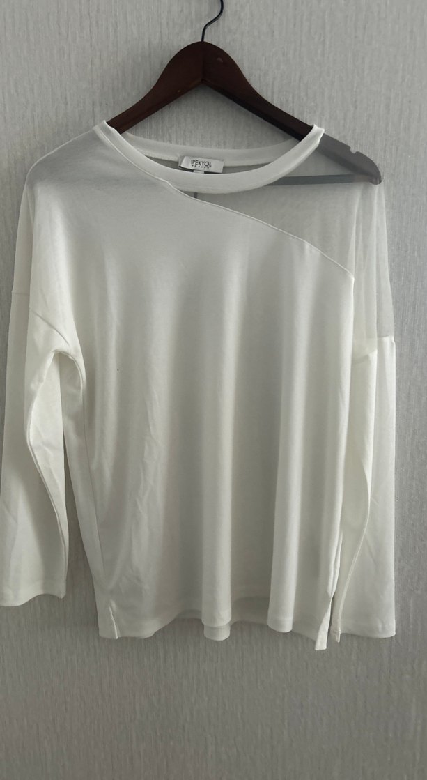 Beyaz renkte, uzun kollu, yuvarlak yakalı ve salaş kesime sahip kadın bluzu. Yumuşak sentetik kumaştan, drapeli ve minimalist tarzda, günlük kullanım için uygundur.