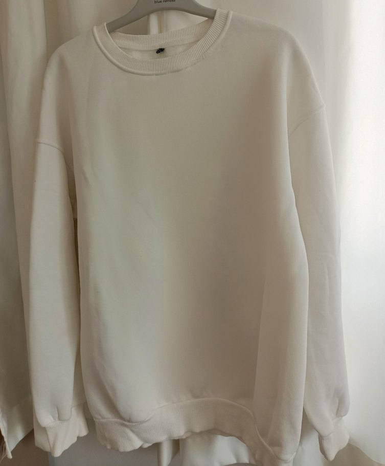 Beyaz, yuvarlak yaka, uzun kollu ve salaş kesim sweatshirt. Yumuşak ve sıcak kumaştan, sade ve minimalist tarzda, günlük kullanıma uygun.