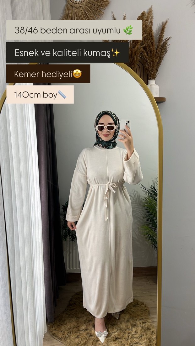Yüksek yakalı, uzun kollu ve bol kesim beyaz elbise, esnek ve kaliteli triko kumaştan yapılmıştır. Kemer hediyelidir ve 140 cm uzunluğundadır.