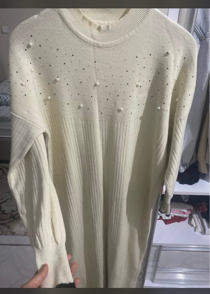 Kadın beyaz triko kazak, uzun kollu ve yuvarlak yaka detaylıdır. Rahat ve uzun kesimi, küçük dokulu süslemelerle günlük sokak stiline uygundur.