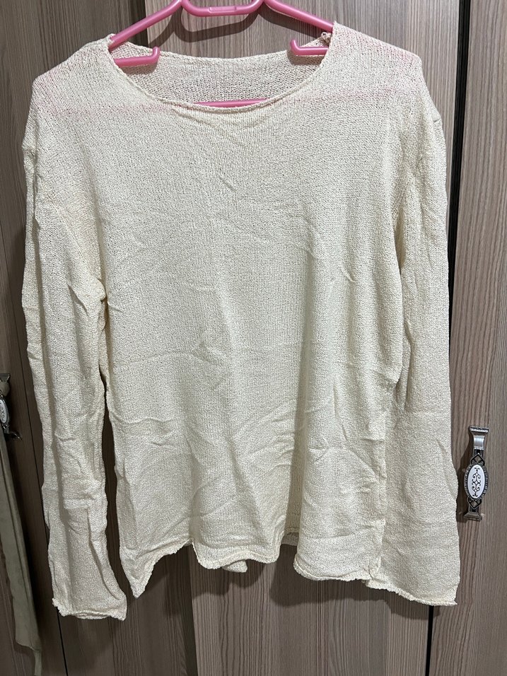 Kadın beyaz uzun kollu, yuvarlak yakalı, örme keten kumaştan yapılmış, bol kesim ve normal midi boyda triko kazak. Rahat ve sade tarzda günlük kullanım için uygundur.