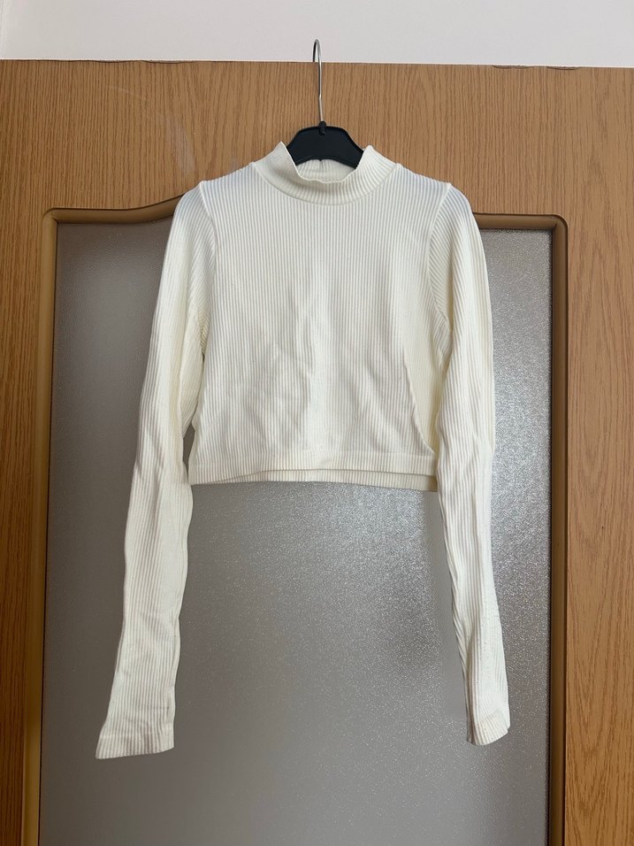 Kadın beyaz uzun kollu, yüksek yakalı ve vücuda oturan kesime sahip triko. Yumuşak keten kumaştan üretilmiştir, minimalist ve şık tarz sunar. Günlük kullanım için hafif ve desensiz tasarım.