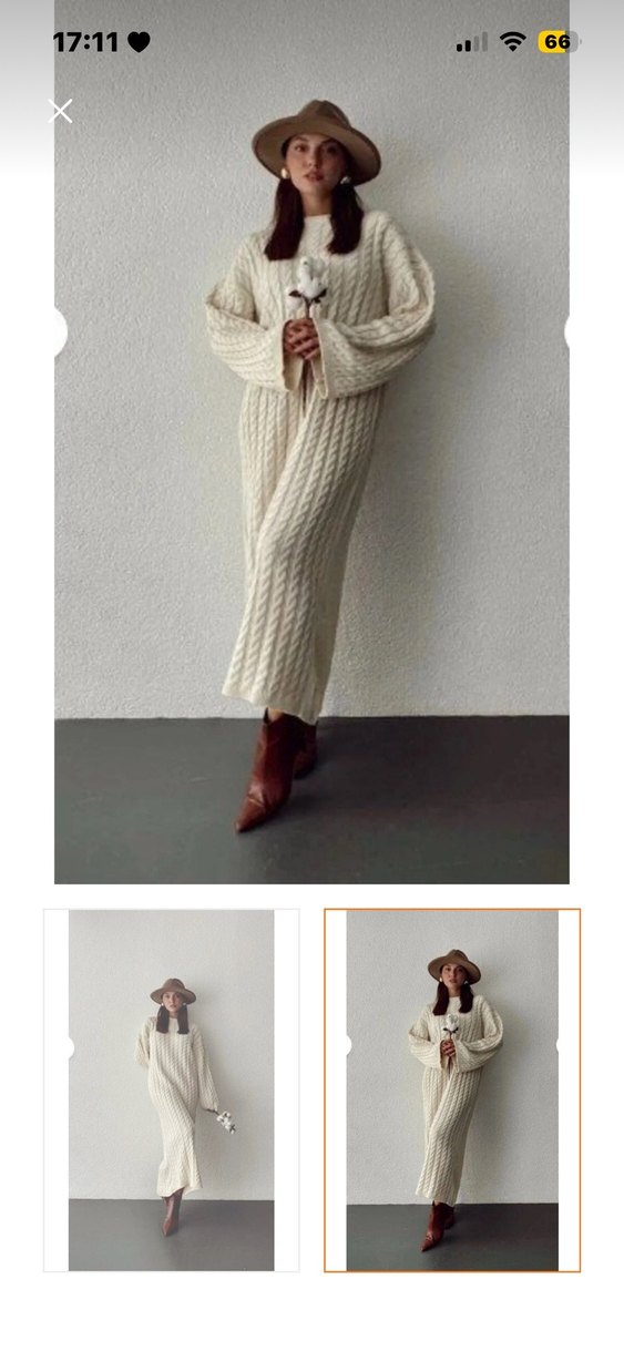 krem örgü elbise, uzun boy ve rahat kesime sahip. Uzun kollu ve gündelik kullanıma uygundur.