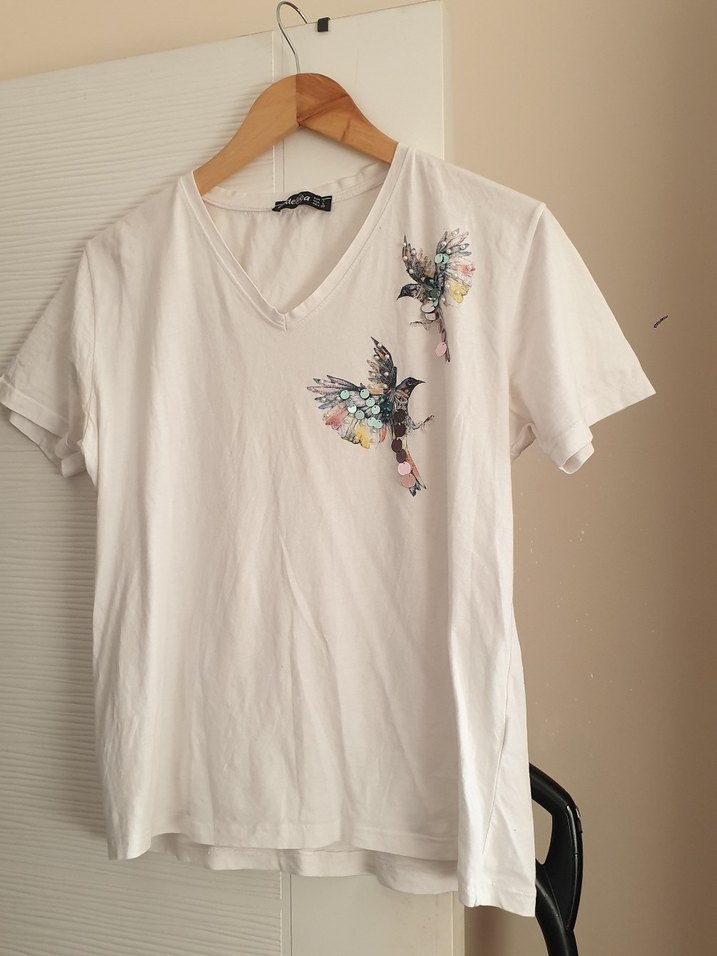 Beyaz pamuklu tişört, V yaka ve kısa kollu, pastel renkli kuş baskısı ile. Rahat kesim ve normal boyda, günlük sokak stili için uygundur. ️