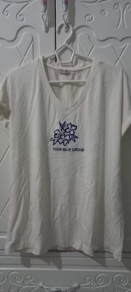 Pamuklu kumaştan, V yakalı ve kısa kollu beyaz tişört. Önünde mavi çiçek baskısı ve "YOUR BLUE DREAM" yazısı bulunur. Rahat ve salaş kesim.