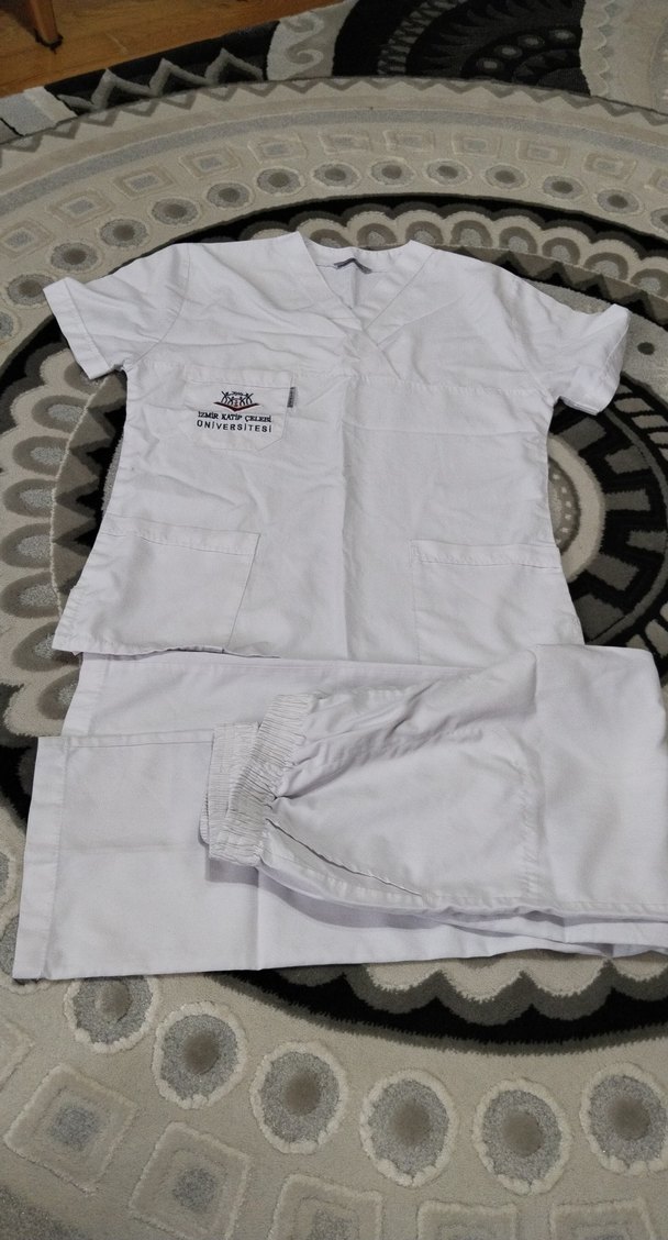 Kadın beyaz, kısa kollu cepli ve V yakalı hemşire forması takımı. zayıf bayanlara rahat olur. 34 ile 38 arası giyer.
