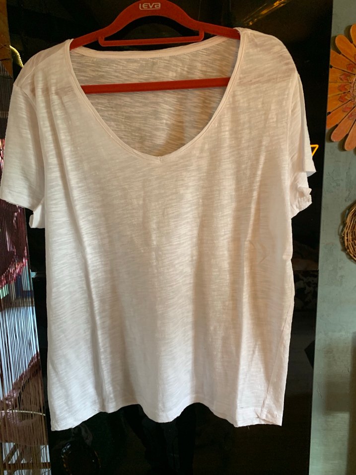 Kadın beyaz keten tişört, V yaka ve kısa kollu, rahat ve bol kesimdir. Desensiz, bohem tarzda günlük kullanıma uygundur.