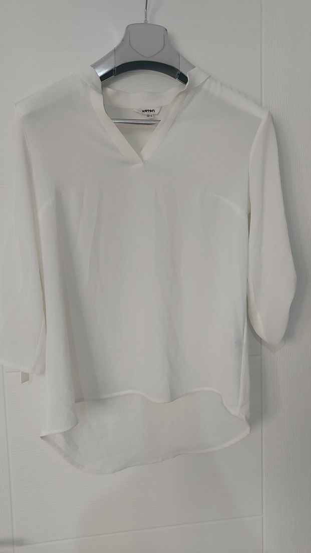 Kadın beyaz bluz, V yaka ve kısa kolludur. Rahat, bol kesimi ve düz deseniyle minimalist, modern bir görünüme sahiptir. Günlük kullanım için uygundur.