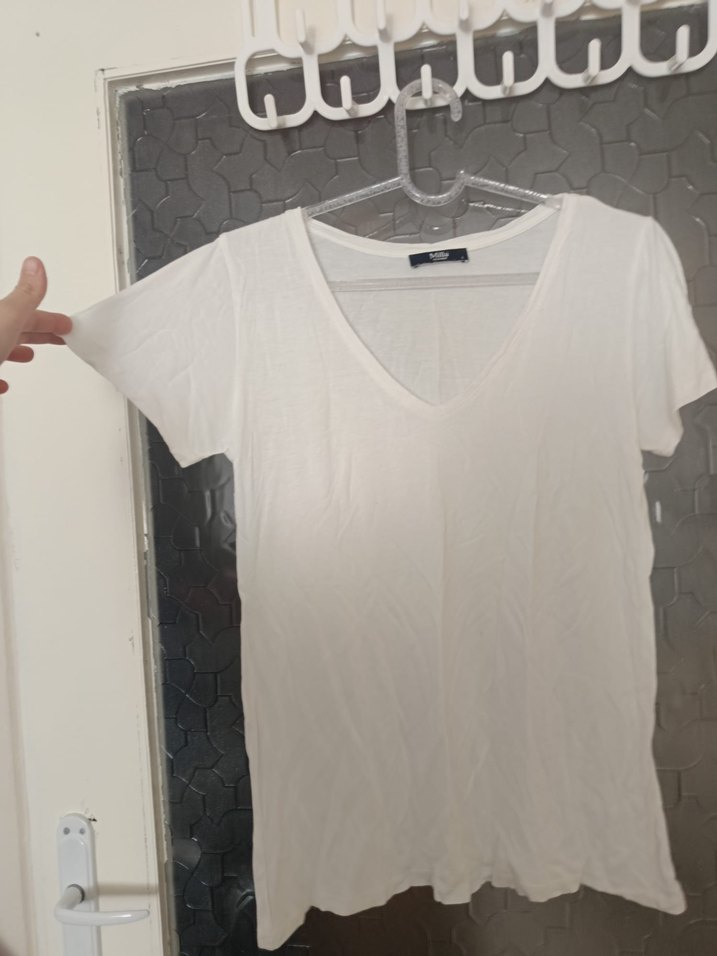 Kadınlar için beyaz V yaka, kısa kollu, pamuklu kumaştan yapılmış ve vücuda oturan kesime sahip tişört. Günlük sokak giyimi için minimalist tarzda.