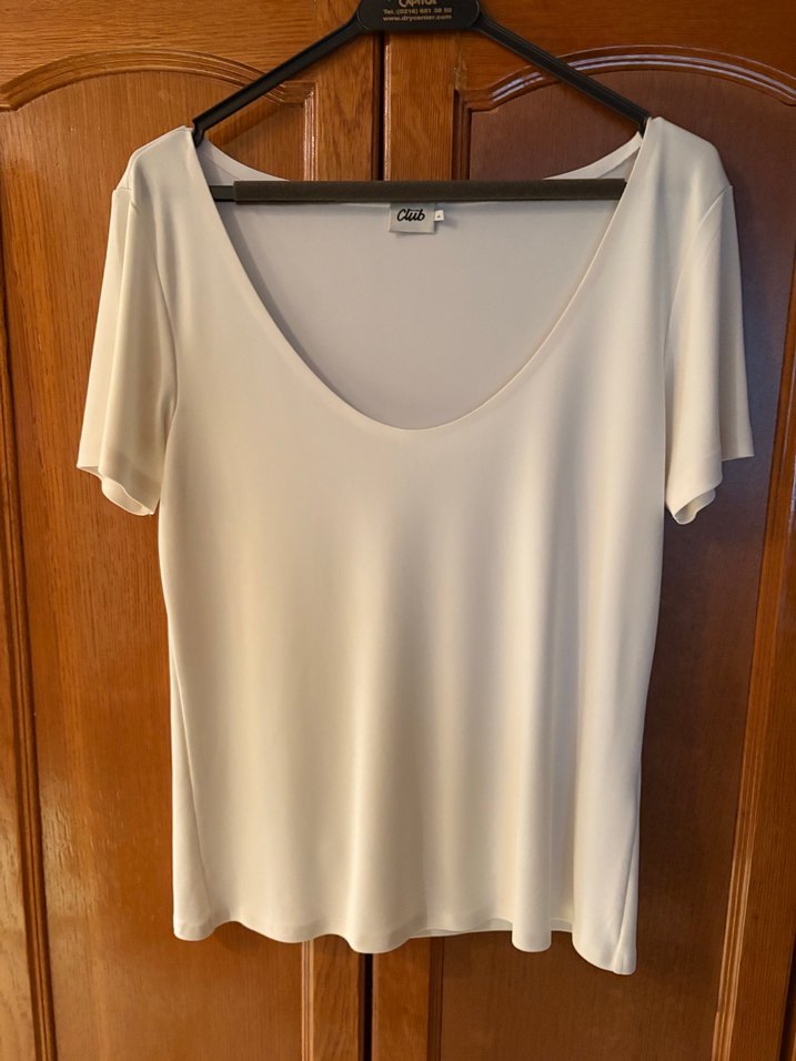 Kadınlar için beyaz, tek renk, tekne yaka ve kısa kollu, bol kesim, ipeksi dokulu tişört. Minimalist ve rahat şıklık sunar, günlük kullanım için uygundur.