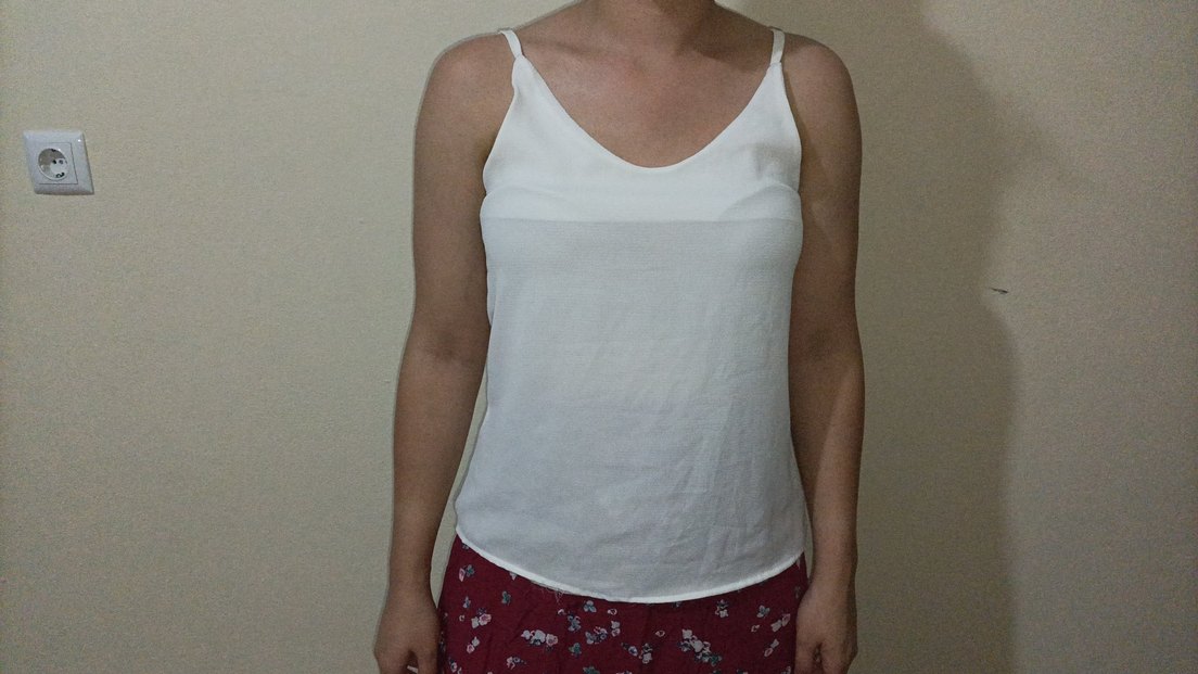 Kadınlar için beyaz, V yaka ve kolsuz, bol kesim basic atlet. Yumuşak pamuk kumaştan, günlük kullanıma uygun sade ve rahat tasarım.