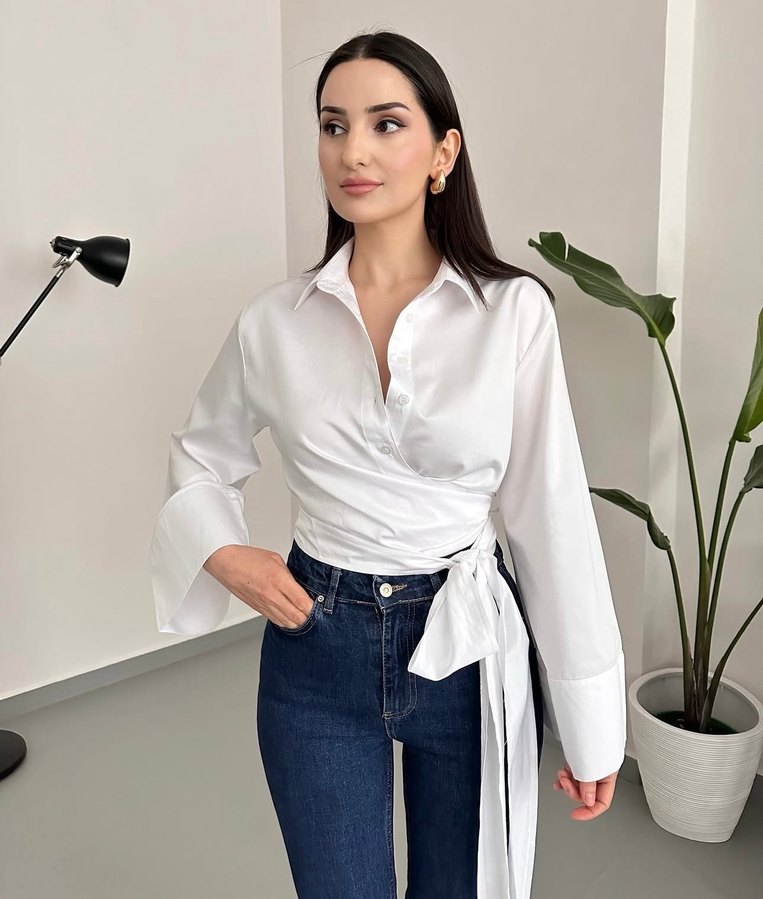 Beyaz, V yakalı, uzun kollu ve kuşaklı denim gömlek. Kısa ve mini boyda, hafif batik desenlidir. Günlük kullanıma uygun.