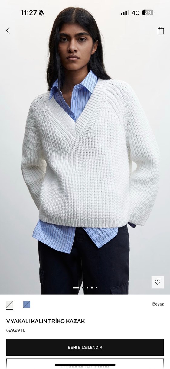 Beyaz örgü pamuk kazak, V yaka ve uzun kollu, rahat kesimiyle günlük sokak stili için uygundur. Desensiz tasarımıyla her gün kullanılabilir.