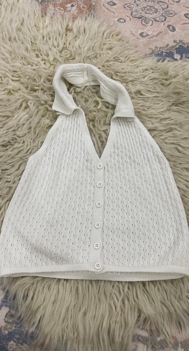 Beyaz renkte, V yaka ve düğmeli önü olan, örgü kumaştan yapılmış, salaş kesim bohem tarzında süveter. Günlük kullanıma uygundur.