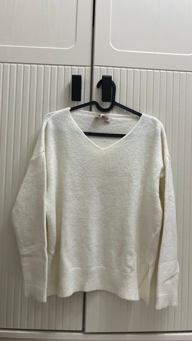 Beyaz renkli, V yaka ve uzun kollu pamuklu triko kazak, rahat ve bol kesimdir. Midi uzunluğuyla günlük sokak modasına uygundur. STANDART BEDENDİR. bir kere giyildi ürün temizdir.