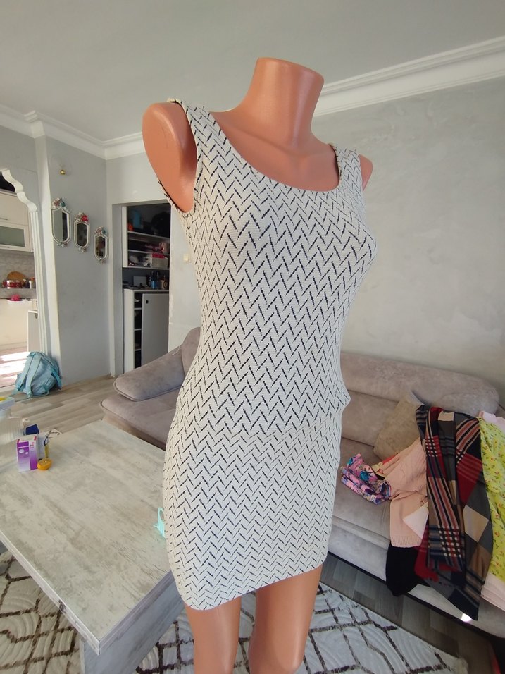 Kolsuz, V yakalı, vücuda oturan triko elbise; ince zikzak desenli, günlük kullanıma uygun.