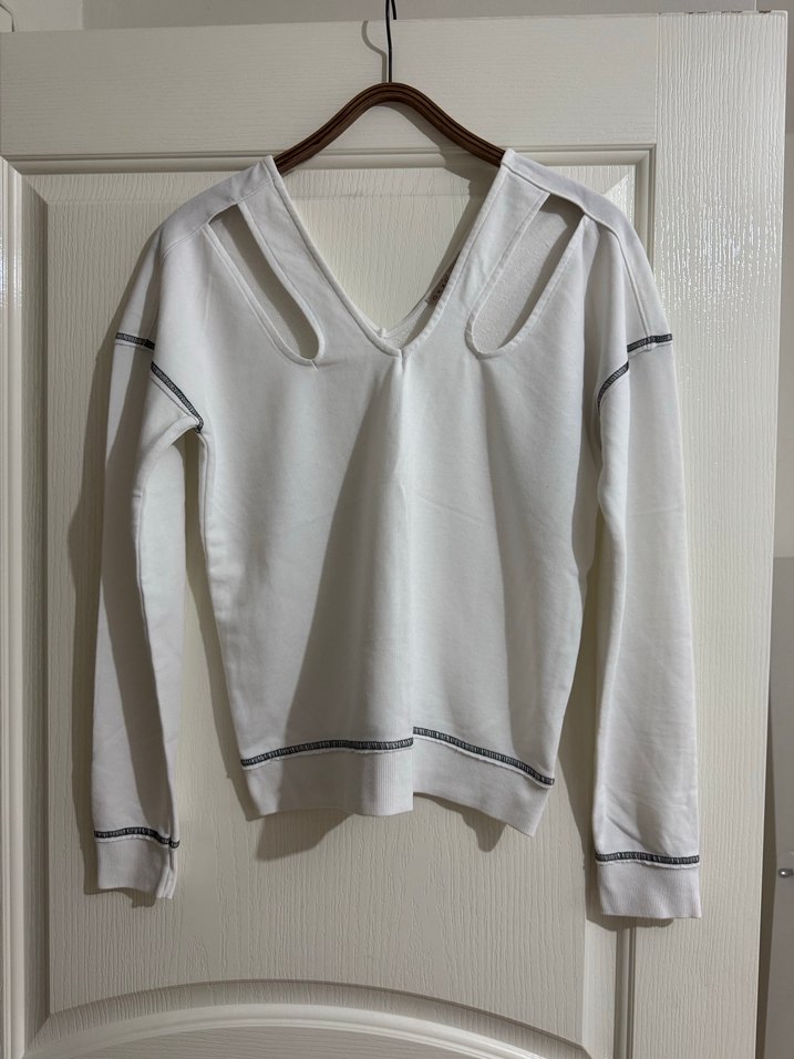 Pamuk beyaz V yaka, uzun kollu sweatshirt. Omuzlarda kesik detaylar ve gri dikişler bulunur. Rahat kesimli, günlük kullanıma uygun.