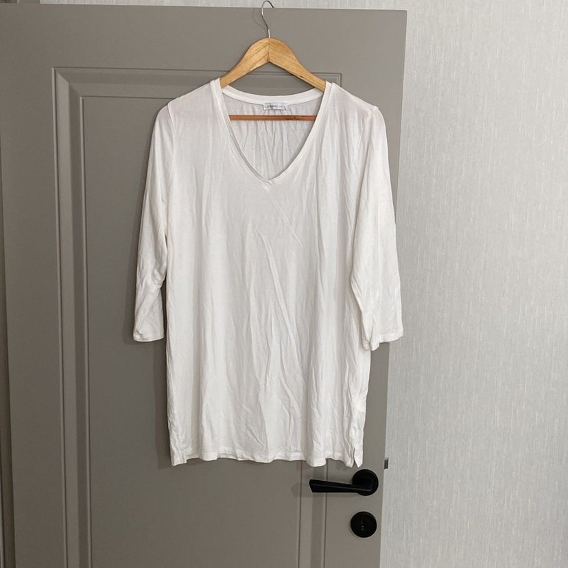 Yumuşak keten kumaştan, V yakalı beyaz kadın tişörtü. Rahat kesimi ve kısa kollu tasarımıyla minimal ve şık bir görünüm sunar.