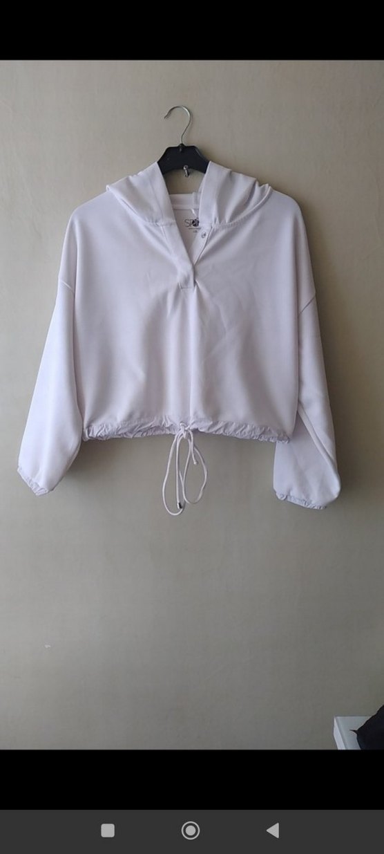 Kadınlar için V yakalı, uzun kollu ve bol kesim beyaz kısa sweatshirt. Sentetik kumaştan, belde bağcıklı, rahat ve şık bir görünüme sahip. Günlük ve sokak stili için ideal.
