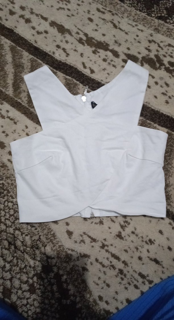 Kadın beyaz renkli, V yakalı, kısa ve fitted kesim sentetik kumaş atlet. Minimalist ve streetwear tarzda, günlük kullanıma uygun.