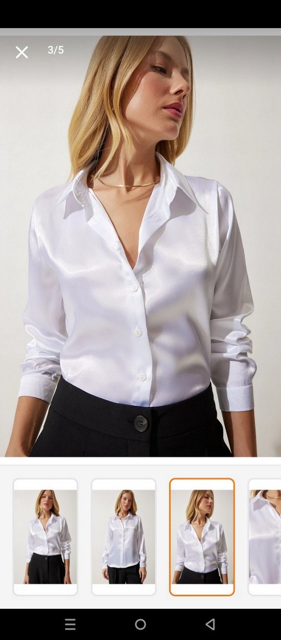 Kadın beyaz gömlek, V yakalı ve düğmeli, saten kumaştan, normal kesim ve uzun kolludur. Parlak, desensiz yüzeyi ve çağdaş tarzı ofis için uygundur.